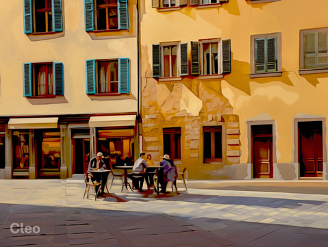 Renaissance-inspired Cityscapes with Vibrant Airy Scenes and Golden Light, Portraying the Elegance of a Coffee Shop and Restaurant in a Painterly Style.