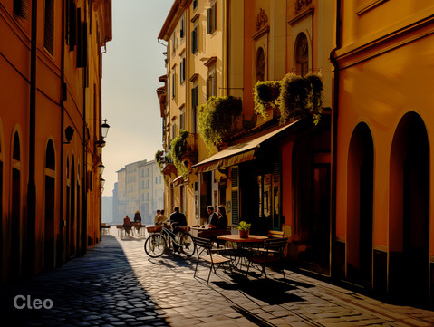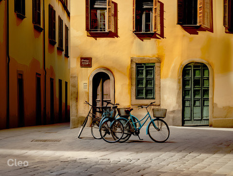 Italian Landscapes with Bikes in Light Turquoise and Amber, Evoking the Warmth of Urban Exploration in Luminous Shadows.